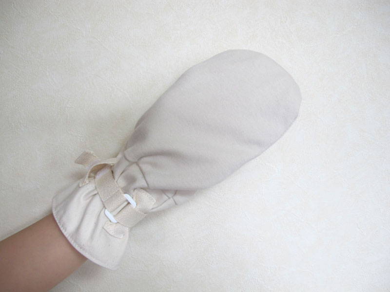 アトピー肌や敏感肌の方には、肌を刺激することが少ないミトンタイプの手袋がお勧めです。 - 綿100%のお肌にやさしい素材でできています。かかない手袋は綿100%の素材でできています。